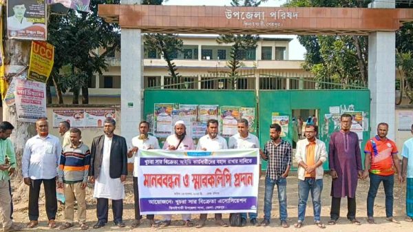সার সংক্রান্ত নীতিমালা ২০২৫ বাতিলের দাবিতে শেরপুরের ঝিনাইগাতী উপজেলার খুচরা সার বিক্রেতারা মানববন্ধন ও স্মারকলিপি প্রদান কর্মসূচি পালন করেছেন। রবিবার (২৩নভেম্বর) দুপুরে উপজেলা পরিষদের সামনে ঘন্টাব্যাপী মানববন্ধন শেষে সার ও