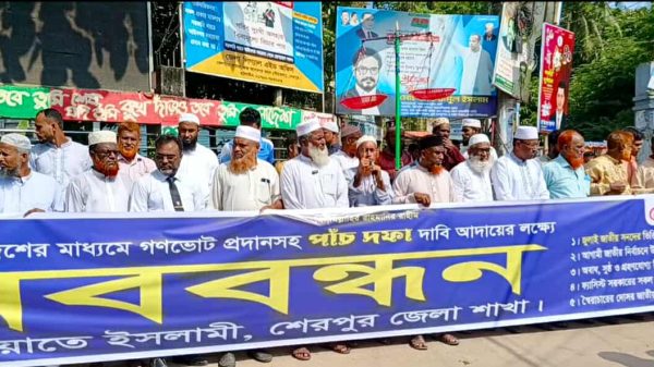 বাংলাদেশ জামায়াতে ইসলামীর কেন্দ্র ঘোষিত কর্মসূচির অংশ হিসেবে সারাদেশের ন্যায় শেরপুরেও জুলাই জাতীয় সনদ বাস্তবায়ন আদেশের মাধ্যমে গণভোট প্রদানসহ পাঁচ দফা দাবী আদায়ের লক্ষ্যে মানববন্ধন অনুষ্ঠিত হয়েছে। বুধবার (১৫ অক্টোবর)