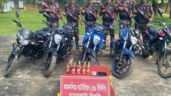 শেরপুর ও ময়মনসিংহ সীমান্তে মাদক ও চোরাচালান বিরোধী অভিযান চালায় বর্ডার গার্ড বাংলাদেশ (বিজিবি)। ময়মনসিংহ ব্যাটালিয়ন (৩৯ বিজিবি)’এর বিশেষ অভিযানে ১৩ লক্ষাধিক টাকার ভারতীয় মদ, মোটরসাইকেল, মোবাইল ফোন ও নগদ