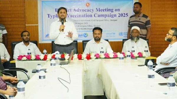 শেরপুরে ‘টাইফয়েড টিকাদান কর্মসূচি-২০২৫’ এর জেলা পর্যায়ের এডভোকেসি সভা অনুষ্ঠিত হয়েছে। বৃহস্পতিবার (১৪ আগস্ট) শেরপুর জেলা সিভিল সার্জন অফিসের উদ্যোগে, বিশ্ব স্বাস্থ্য সংস্থা, ইউনিসেফ ও গ্যাভিসহ অন্যান্য উন্নয়ন সহযোগীদের সহযোগিতায়
